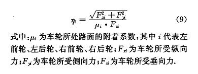 考虑车辆所受的广义力(本文中为横摆力矩)在 4 个车轮之间如何分配最合理这一问题时需要选择一个优化目标。文献 [19-20] 提出轮胎利用率这一概念,表述为单个轮胎上的路面附着力与所能获得的最大附着力的比值,如式 (9) 所示:
