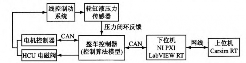 采用某型号工作站作为实时控制平台(即上位机)。在上位机的 Carsim/RT 软件中搭建整车模型。采用 NI/PXI 某型号机箱作为下位机。上下位机通过以太网连接。控制策略在 Matlab/Simulink 软件中建立。各模块之间采用控制器局域网络(Controller Area Network,CAN)通信,传递控制指令或传感器信号等。