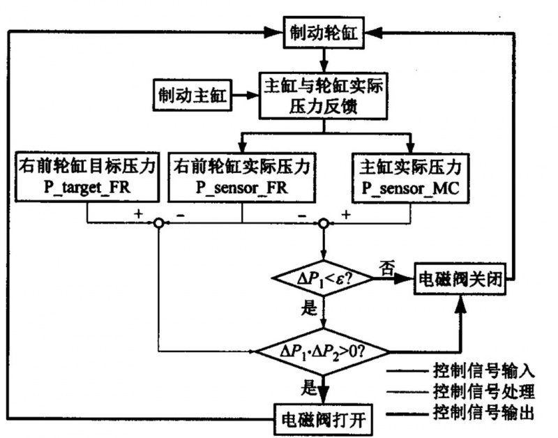 个轮缸的目标压力,且其抖动的压力频率大大高于各轮缸目标压力的频率,每当主缸压力靠近轮缸的目标压力时,适时地开闭电磁阀以使轮缸压力跟踪目标压力变化。