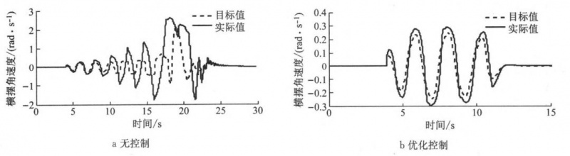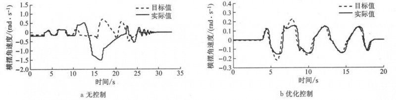 之间实际值严重偏离了目标值,且实际值变化幅度较大,甚至实际值的方向与目标值的方向相反,会导致车辆失稳不可控。而低附路面优化控制时,横摆角速度跟踪误差较小,相比无控制时大大提高了车辆稳定性和安全性。