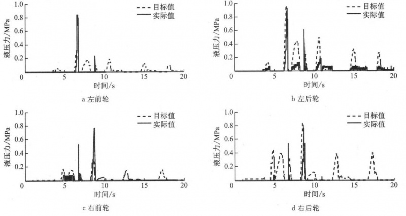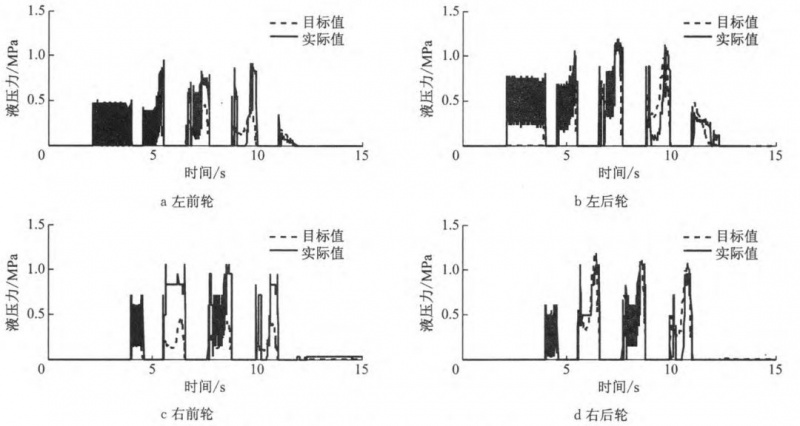 图 8 为低附路面优化控制时各车轮轮缸压力响应。由图可知,液压力控制虽然有一定误差,但能够满足车辆稳定性控制的要求。