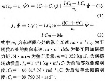 文献 [5-6] 采用的线性二自由度车辆模型是多数驾驶员熟悉的车辆特性,反映了车辆线性区域的响应。由线性二自由度车辆模型得到的理想的横摆角速度及质心侧偏角对前轮转角均是二阶系统的传递特性[7]。