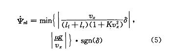 另外,在车辆具有高横摆角速度的情况下,当路面不能够提供足够的附着力时,此时根据式 (3) 来计算理想横摆力矩是不安全的。应该对横摆角速度设定上限或l,即式 (4) 所示: