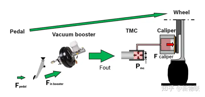 以下所示盘式制动器为例,驾驶员踩下制动踏板,由于杠杆作用,踏板力经过第一级放大传递到真空助力器;真空助力器经过第二级放大将制动力传递到主缸;主缸的制动液被推入轮缸并在压强的作用下产生更大的制动力,推动轮端卡钳加紧刹车盘阻碍刹车盘转动,从而实现制动。
