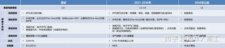 • 转向系统:以EPS(带冗余方案:传感器、电机、电源、控制器等冗余)方案为主,总线采用CAN FD;